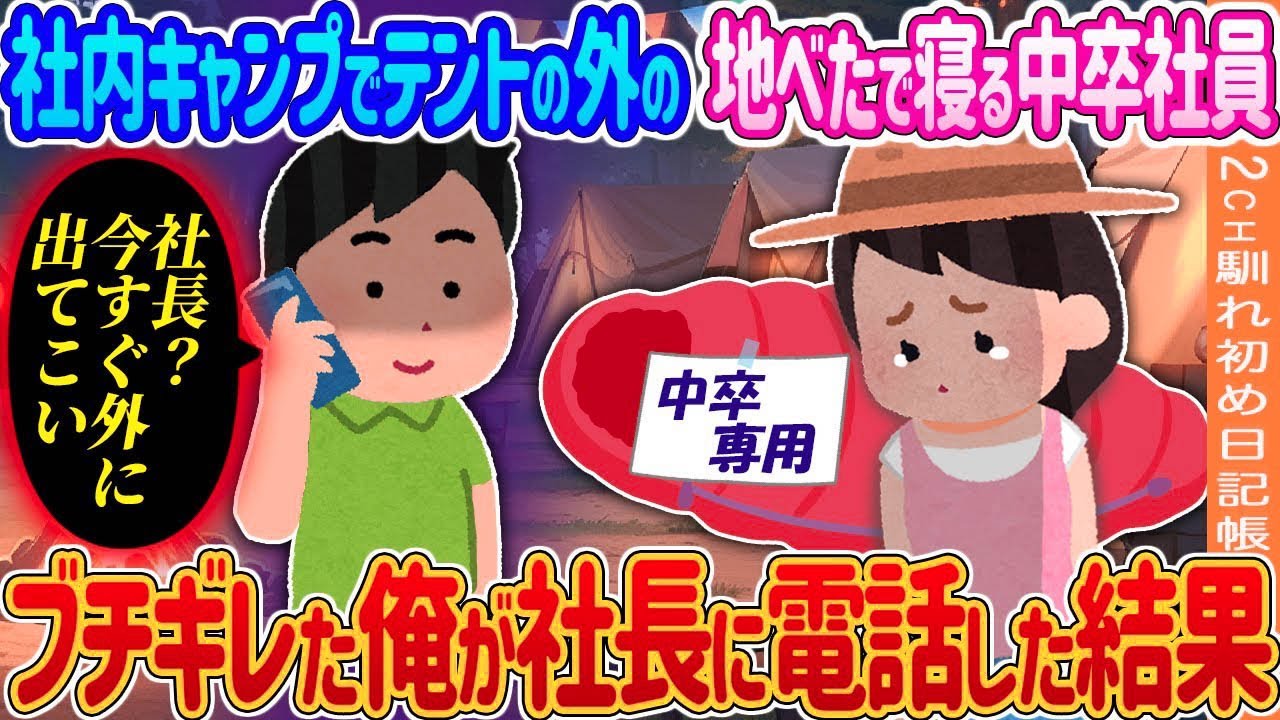 タイトル | 【2ch馴れ初め】社内キャンプでテントの外の地べたで寝る中卒社員→ブチギレた俺が社長に電話した結果…【ゆっくり】 |