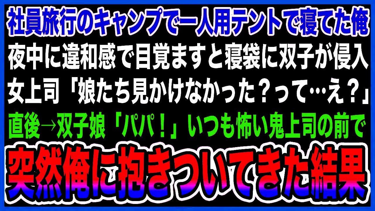 タイトル【感動する話】社員旅行のキャンプで一人用テントで寝てた俺。翌日目覚ますと寝袋に双子がいて上司「娘たち見かけなかった?って…え?」「パパ!」いつも怖い鬼上司の前で俺に抱きついてきた結果【泣ける話・朗読】