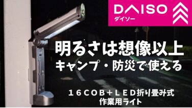 ランタン 【ダイソー550円】明るさは想像以上⁉キャンプや防災で使える乾電池使用 懐中電灯&ランタン【16COB+LED折り畳み式作業用ライト】 – フィッシュ中山のLightCh 出典:YouTube / フィッシュ中山のLightCh 2025.10.08 ランタン