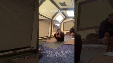 テント キャンプでガルバピンダーサナにチャレンジ TOMOUNT エアーテント 12㎡ インフレータブルテント & マンドゥーカプロトラベル – えびすヨガスタジオ 出典:YouTube / えびすヨガスタジオ 2025.10.02 テント